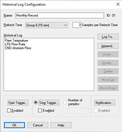 I don’t know that it’s the root of your issues, but if you’re only logging one row per 15 minutes, you probably don’t need to buffer lines or keep the file open. If PAC Display Runtime were to crash with 19 lines in the buffer before writing, you could lose almost 5 hours of data. Ideally that wouldn’t happen, but I’ve noticed that random Windows events can knock out PAC Display Runtime at times, so maybe give those changes a shot.