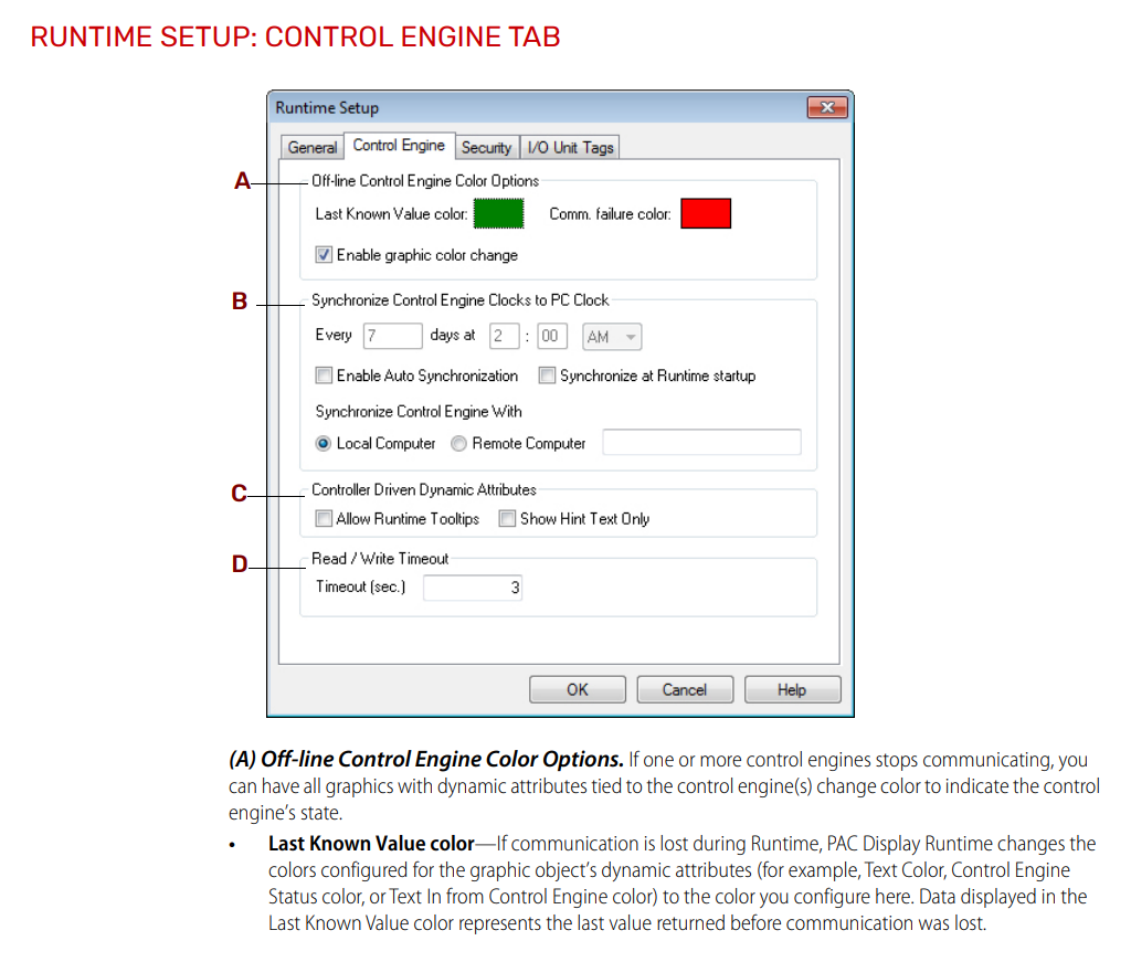 You are seeing the colors that were configured in the Runtime setup for the Control Engine tab (PAC Display User’s Guide). Red is the default communication failure color.